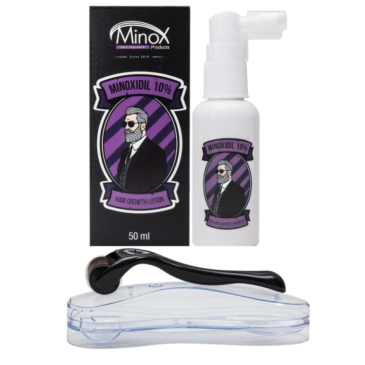 Набір для стимуляції росту волосся та бороди (мезоролер + лосьйон для росту волосся та бороди Minox 10% 50 мл)